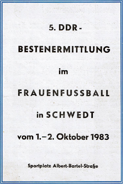 Die Arbeit in Schwedt wurde auch vom Deutschen Fußballverband der DDR anerkannt. Als Lohn für die bisherige sportliche Entwicklung wurde die Endrunde zur 5. DDR-Bestenermittlung der Frauen 1983 an die BSG Chemie PCK nach Schwedt vergeben. Sieger wurde einmal mehr Turbine Potsdam vor Wismut Karl-Marx-Stadt (dem einstigen und heutigen Chemnitz) und Chemie Schwedt. Die Schwedterinnen hatten einen schwachen ersten Tag, spielten im Modus jeder gegen jeden in 1x40 min gegen EAB 47 Berlin 1:1 und verloren gegen Wismut Karl-Marx-Stadt mit 2:1. Die Steigerung am 2. Spieltag, mit dem 1:0-Sieg gegen Fortschritt Erfurt und dem 0:0 gegen Turbine Potsdam (Turbines einziger Punktverlust), brachte am Ende noch den 3. Platz. Die Erfolge, 1984 wurde man ein letztes mal Hallenbezirksmeister, hatten danach ein abruptes Ende, als aus finanziellen Gründen die erfolgreichste schwedter Fußballmannschaft aufgelöst wurde. Hauptursache war wohl die gedrosselte Unterstützung der Sektion Fußball durch den Trägerbetrieb (PCK Schwedt) nach dem Ligaabstieg der 1. Männermannschaft 1984. Der Unbeteiligte kann sich nur in Ansätzen vorstellen, was in den Köpfen, der für die Auflösung Verantwortlichen, damals vorging. Die betroffenen Spielerinnen und Betreuer quittierten es mit Fassungslosigkeit und auch einige Fans zeigten dafür berechtigtes Unverständnis. Daß man eine erfolgreiche Mannschaft so einfach demontieren konnte, zeigt den damaligen Stellenwert des Frauenfußballs. Im DFV der DDR war der Frauenfußball der Kommission für Freizeit- und Erholungssport zugeordnet. Für die damaligen Spielerinnen sicher ein erniedrigender Fakt, den sie aus Spaß am Fußball verdrängen konnten. Zwischen 1978 und 1983 (bis einschließlich Endrunde in Schwedt) trug Chemie insgesamt 152 Spiele aus von denen 109 gewonnen wurden, 15 mal trennte man sich vom Gegner unentschieden und 28 mal wurde verloren. Rekordtorschützin wurde Jutta Edelhoff. Zu den weiteren Stützen der Mannschaft zählten die Sportfreundinnen Mielke, Schiele, Dost, Ney u.a. Erst in den frühen "Nachwendejahren" wurde der Frauenfußball in Schwedt wieder reaktiviert. (Ende Teil 1 - wird fortgesetzt)